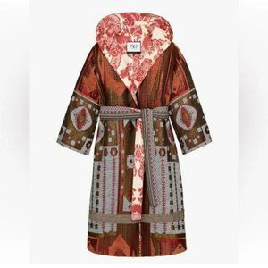 High collar with removable faux fur trim and long sleeves. Tied self belt. Wide cotton band with antiqued gold pyramid studs at hem. Inner lining with floral print.
