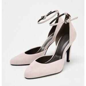 Chic, feminine, and ultra-polished — these ZARA almond-shaped toe heels feature genuine pink suede leather, a sleek thin high heel, and an elegant ankle strap with buckle closure. The pointed-almond silhouette creates a soft, elongated line that pairs perfectly with dresses, tailoring, or denim.
