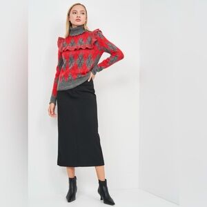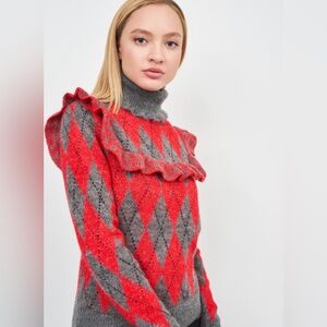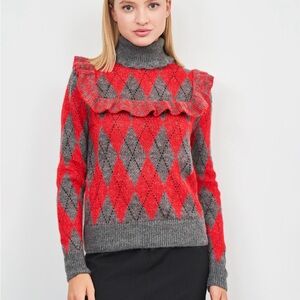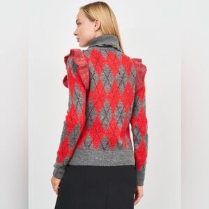 ZARA Argyle Mohair Turtleneck Sweater With Ruffles High Neck in Red Gray