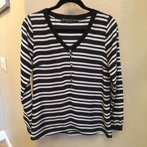 ZARA BASIC Black/White Stripe Long Sleeve Top Size Xsmall in excellent condition with no rips or stains. It has gold buttons and fabric is slightly sheer. Comes from smoke and pet free home.