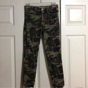 Size US 02 Zara Basic camouflage denim jeans. Factory distressed with hem being slightly higher in front than in back. Five pocket design, with zipper and button closure. These can be dressed up or dressed down and are sure to be a favorite in any closet.