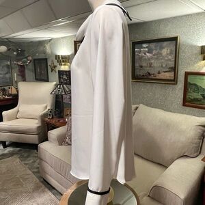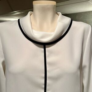 This stylish blouse provides that versatile look and staple for your wardrobe in any season. Features a semi-cowl neck front with keyhole back. Loop and button closure. Silky ivory white fabric with black accent piping. Classic, comfy, relaxed fit. Just beautiful.