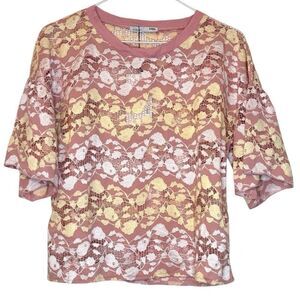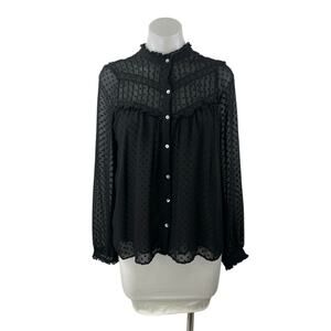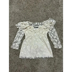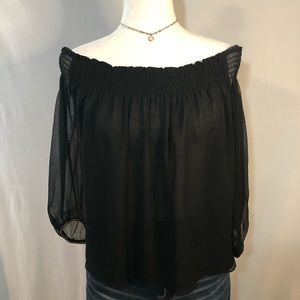 Only wore once! This is a sexy sheer off the shoulder top. Great for a night out on the town! Only the arms are sheer, the body is lined. The top hits at the right spot on the top of a pair of jeans. The bottom of sleeves have gold beaded detailing. Very well made top that your will have in your arsenal for a long time!