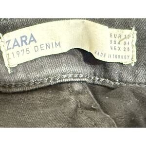 This is a pair of Zara Basic Z1975 denim jeans in black, designed for juniors in size 4 with a waist size of 24-26". The jeans feature metal rings on the sides, a slim fit, low rise, and a raw hem. They are made of cotton denim fabric and have a zip closure. The inseam is 26 inches, and they have a skinny style.