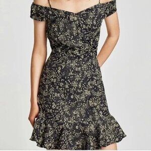 ZARA BASIC Z1975 Denim Off The Shoulder Dress Navy Blue W/ Cream Floral Print