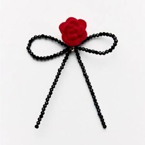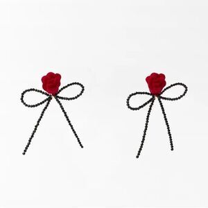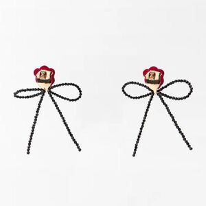 Metal dangle earrings in a bow shape with beads and a contrasting colour block flower appliqué. Push-back fastening.