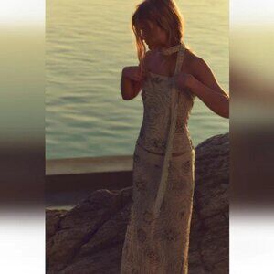 Strapless top with straight neckline. Self foulard scarf detail and contrast beading.