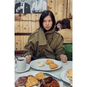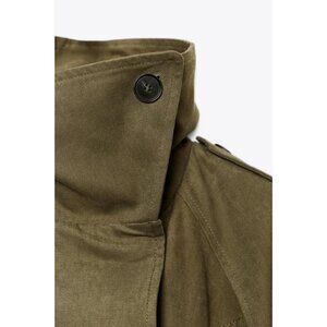 Trench coat made from 100% cotton yarn. High neck. Long sleeves with tabs on the shoulders and cuffs. Front flap pockets. Tie belt in the same fabric. Contrasting lining. Front button fastening.