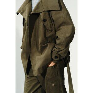 Trench coat made from 100% cotton yarn. High neck. Long sleeves with tabs on the shoulders and cuffs. Front flap pockets. Tie belt in the same fabric. Contrasting lining. Front button fastening.