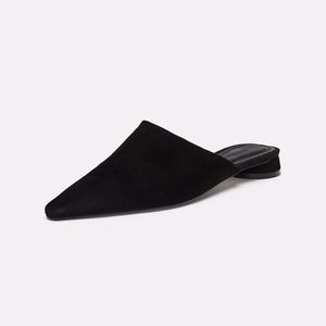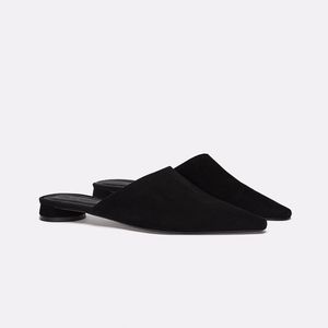 100% Black leather mules. Soft leather upper. Pointed toe. Leather-lined round heel.