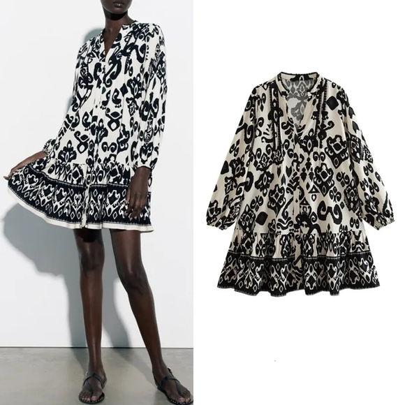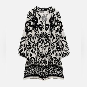 ZARA BLACK AND WHITE SHORT DRESS TUNIC PRINT DRESS BUTTONS LONG SLEEVES SIZE S
