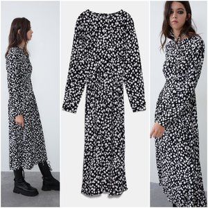 ZARA BLACK & WHITE PRINTED ELASTIC WAIST MIDI DRESS