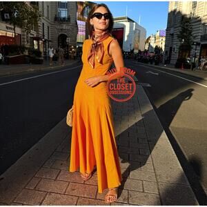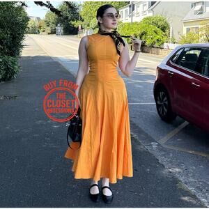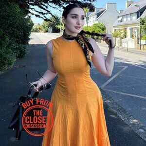 BLOGGER FAVE!!! Orange midi dress made of cotton blend fabric. Round neckline and sleeveless design. Vertical seams that end in small godets, giving the skirt a swing shape. Back hidden in-seam zip closure. From ZARA, in size M and L. New with tags. Sold out in stores.