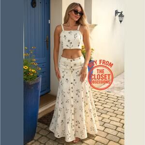 BOTTOM: Ecru maxi skirt with a high waist made of viscose and 17% linen blend fabric. Side hidden in-seam pockets. Contrasting floral embroidery detail. Front closure with zipper and flower shaped button. From ZARA, in size M and L. New with tags. Sold out in stores.