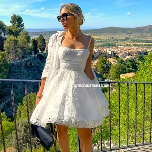 BLOGGER FAVE!!! Oyster white short dress with sweetheart neckline and thin straps. Embroidered eyelet detail. Tonal interior lining. Hidden in-seam zip closure. From ZARA, in size L. New with tags. Sold out in stores.