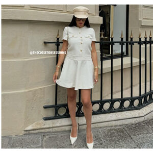 CHANEL VIBES!!! BLOGGER FAVE!!! Ecru mini dress with round neck and short sleeves. False welt pockets with flaps at chest. Textured fabric detail and embossed metal buttons. Side hidden in-seam pockets. Swing skirt. From ZARA, in size M and L. New with tags. Sold out in stores.