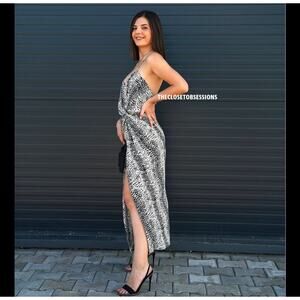 BLOGGER FAVE!!! Black/white long dress with V-neck and spaghetti straps. Ruched detail. Front slit at hem. Back hidden in-seam zip closure. From ZARA, in size XL. New with tags. Sold out in stores.