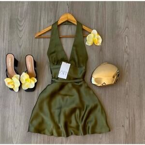 BLOGGER FAVE!!! Moss green short dress with deep V-neckline. Open back with self tie. Tonal interior lining. Side hidden in-seam zip closure. From ZARA, in size L. New with tags. Sold out in stores.