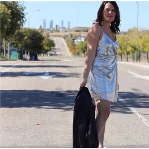 Short dress with V-neckline and thin straps. Sequins and front knot detail.