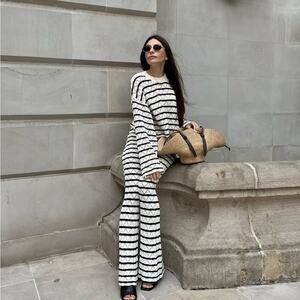 Stylish knit set with black and white stripes. Features a cropped top and wide-leg pants. Perfect for a trendy look.