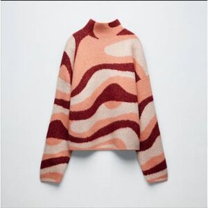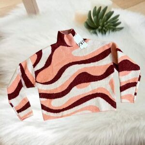 TRENDY WOOL BLEND ZARA MOCKNECK/ TURTLENECK SWEATER WITH RETRO MOD STYLE RED PINK SWIRL, JACQUARD KNIT, OVERSIZED, VERY STRETCHY, INCREDIBLY SOFT (NOT ITCHY)! COZY AND SUPER WARM