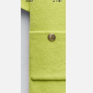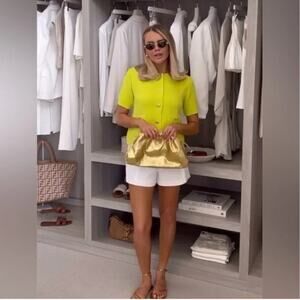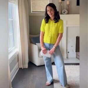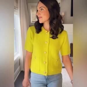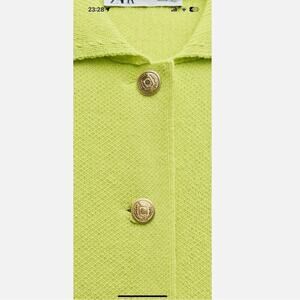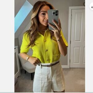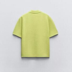 This top is a short-sleeved button-up cardigan with a boxy silhouette. It features a vibrant lime green color, giving it a fresh and modern look. The top has a classic collar and five buttons down the front, as well as two large front pockets at the waist, each secured with a button. The material is textured, adding some depth to the design, and the overall style combines elements of both casual and chic, making it versatile for various outfits.