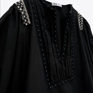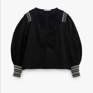 Blouse with round collar and V-neck front. Long sleeves with balloon shoulders and lace cuffs. Matching fabric and beads at chest. 65% Polyester, 35% Cotton