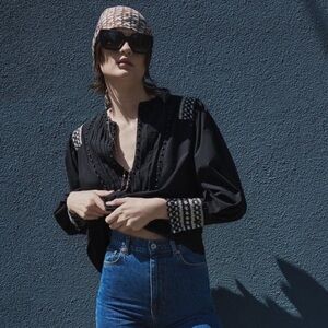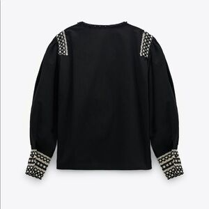 Blouse with round collar and V-neck front. Long sleeves with balloon shoulders and lace cuffs. Matching fabric and beads at chest. 65% Polyester, 35% Cotton