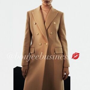 Lapel collar and long sleeves. Flap pockets at front. Back vent. Front double breasted metal button closure. 75% wool 25% polyamide