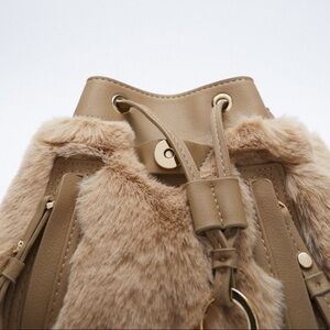 Taupe Backpack. Faux fur exterior. Two front pockets with zip closure. Adjustable shoulder straps. Lined interior with pocket. Drawstring and magnetic closure.