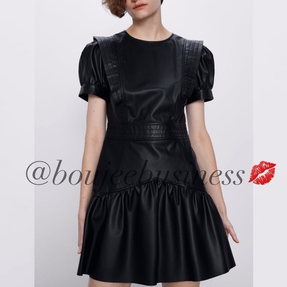 Dress with round neck and short balloon sleeves. Ruffle trim at chest. Flounced hem. Back hidden zip closure. 100% Polyester