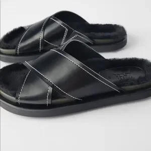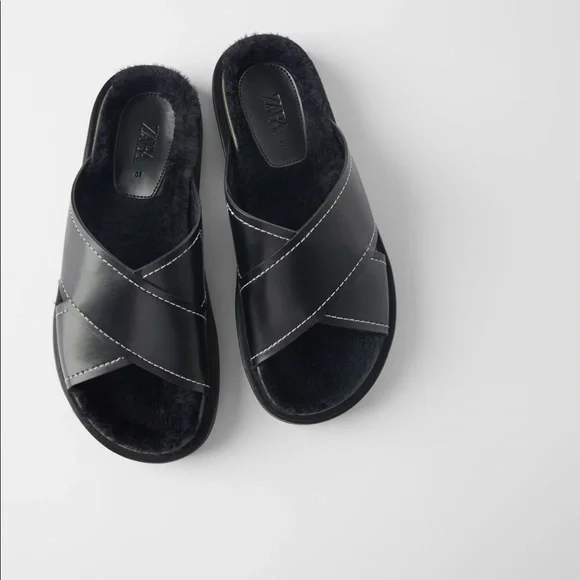 Black slide sandals. Wide crossed straps at front with contrasting topstitching detail. Faux fur lined insole. Lug soles.