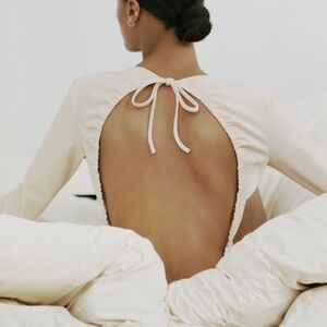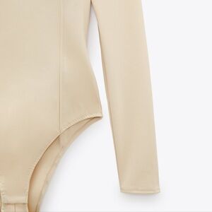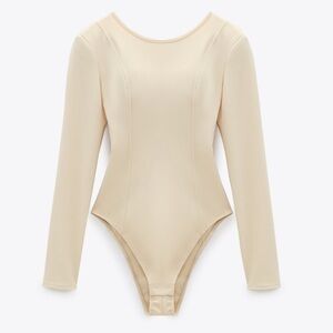 Round neck bodysuit with long sleeves withy shoulder pads. Bottom snap button closure. Back tie and hidden in-seam zip closure. Lining.
