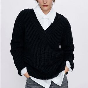 Long sleeve knit sweater with V-neck front and back. 100% Acrylic
