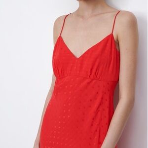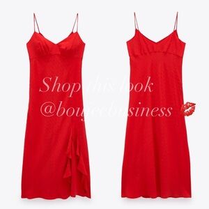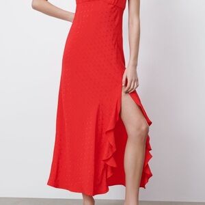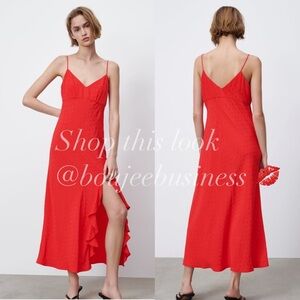 V-neck dress with spaghetti straps. Flounced hem and front slit. Side hidden in-seam zip closure. 100% viscose