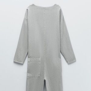 Long wide fit jumpsuit with V-neck and long sleeves. Front and back patch pockets. Front button closure. 100% cotton Color: Gray