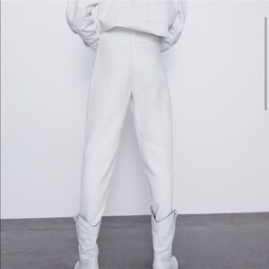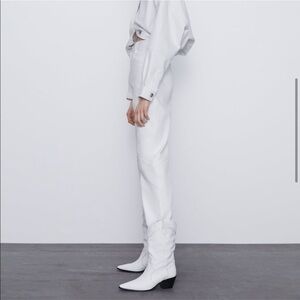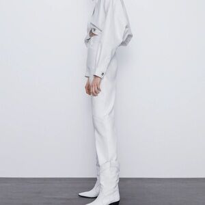 High waisted trouser with side pockets. Featuring matching seams and zip fly and metal tip button fastening.