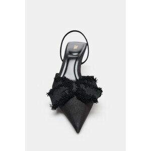 Slingback shoes. Bow detail on the front. Stiletto heel. Elastic back strap. Pointed toe.