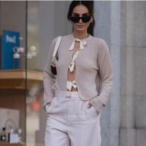 Cardigan made of wool and alpaca blend. Round neck and long sleeves. Front closure with ties.