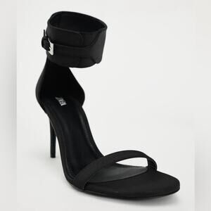 High heel fabric sandals. Buckled wide strap at ankle. Thin strap at front.