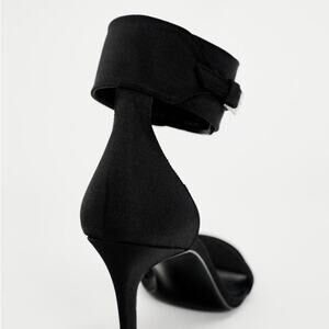 High heel fabric sandals. Buckled wide strap at ankle. Thin strap at front.
