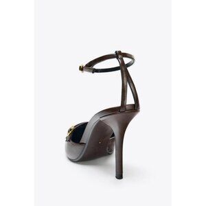 High-heel slingback shoes. Straps on the front with metal buckle detailing. Ankle strap fastening. High stiletto heel. Pointed toe.
