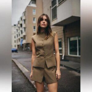 Sleeveless crew neck top. Front false welt pockets. Matching interior lining. Front closure with lined buttons.