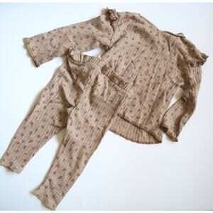 ZARA Baby neutral floral print cozy set, size 9-12 months. This adorable set is perfect for your little one! It features a soft, stretchy ribbed material in a beautiful neutral light brown color with an all-over floral print. The set includes a long-sleeve top and pants, both with delicate ruffle detailing that adds a touch of sweetness.