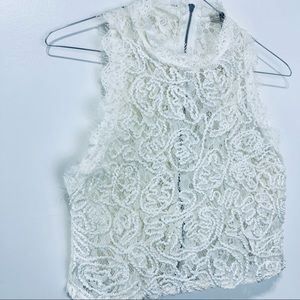 Brocade Lace Crop top with back zip closure and high neck. Sleeveless. New with tags. Approx measurements taken lying flat.