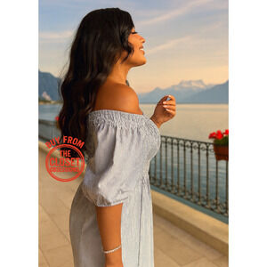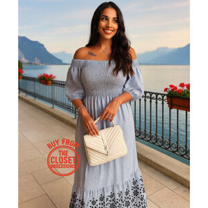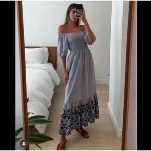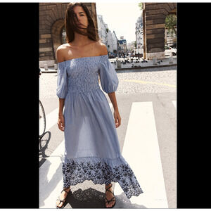 Blue/white dress with smocked elastic straight neckline. Below the elbow balloon sleeves with elastic cuffs. Flounced hem with embroidered eyelet. From ZARA, in size S and M. New with tags.
