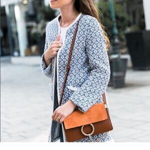 ZARA Basic Blue White Tweed Open Front Jacket Women’s XL Tribal Woven Fringe Coat