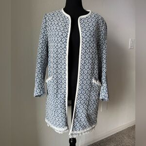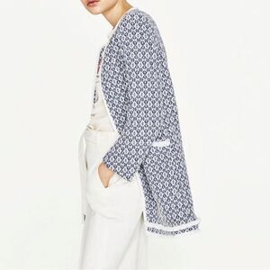 ZARA Basic BlueWhite Tweed Open Front Jacket Women’s XL Tribal Woven Fringe Coat