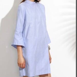 ZARA Basic Collection Women's Shirt Dress in Light Blue Chambray with 3/4 length Bell Sleeve in Size Small, short-mini. Features side pockets, double button closure at the back of the neck and keyhole back opening. The material tag is missing, but I believe it to be cotton. Please see all photos for condition and approximate measurements.