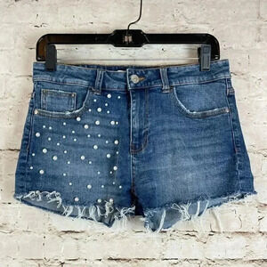 Women's ZARA Basic Denim Jean Shorts Size 4. Medium Wash with Pearl embellishment's on one side. 5 Pocket in a Cut Off/Frayed Style. NOTE: Content Tags have been removed. Gently Used. Please see picture's.